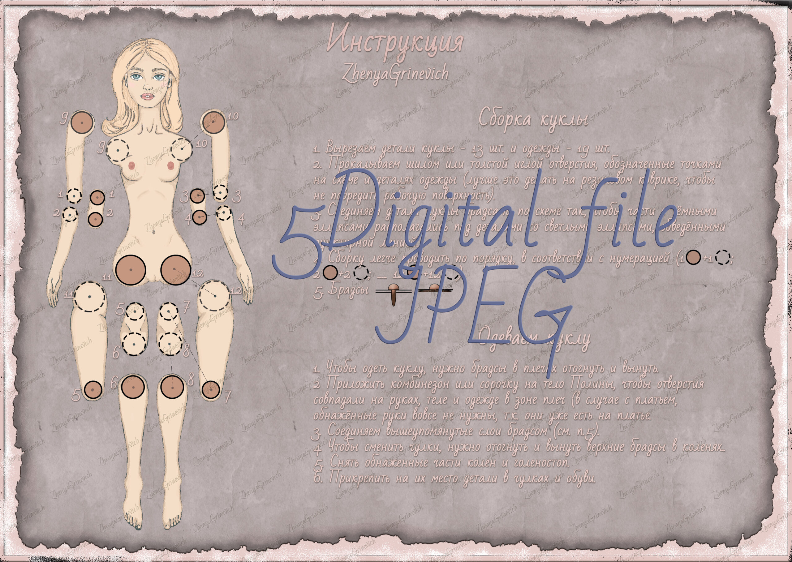 2 digital pages with instructions for assembling the doll and an envelope for its storage and play images