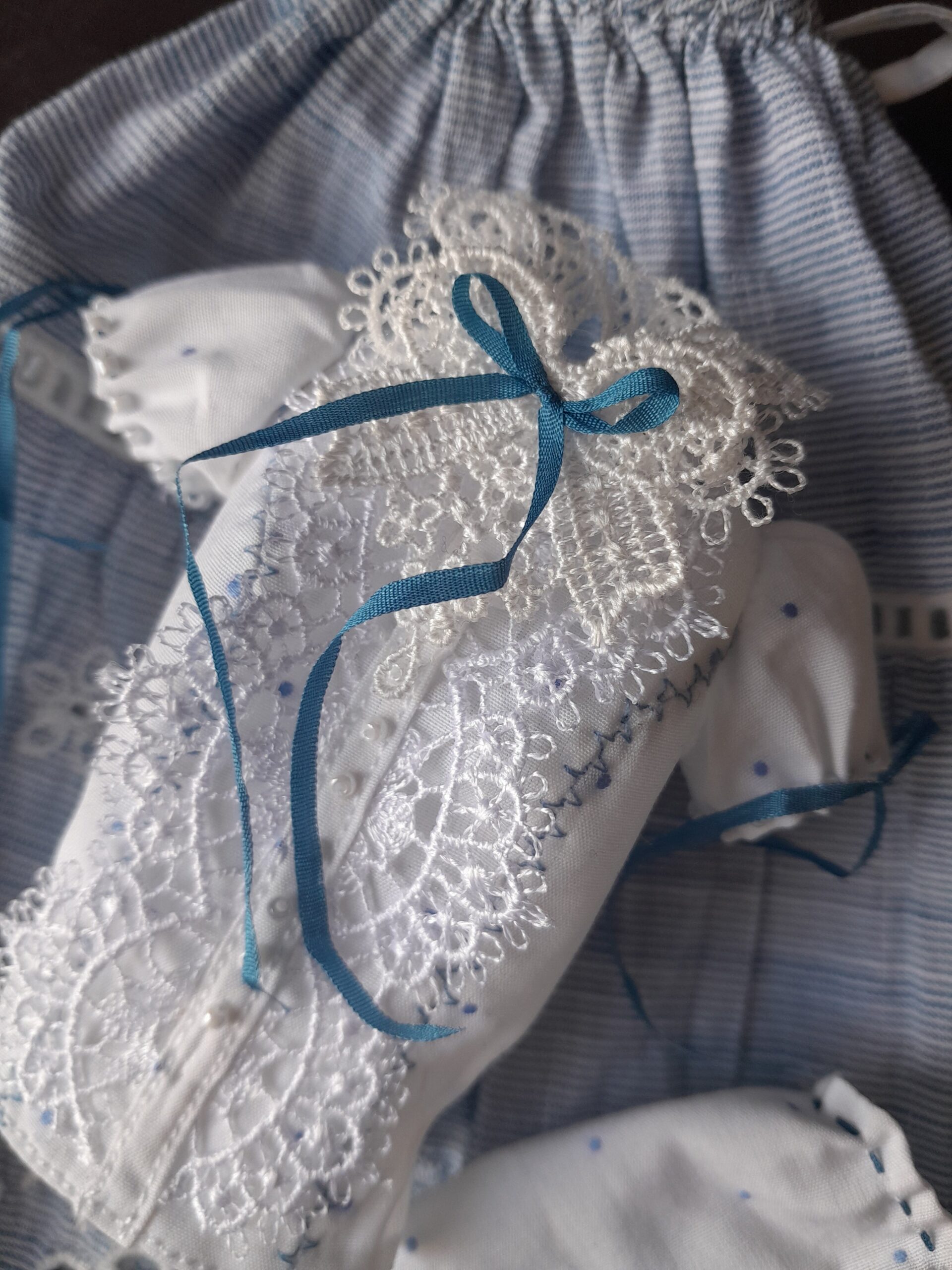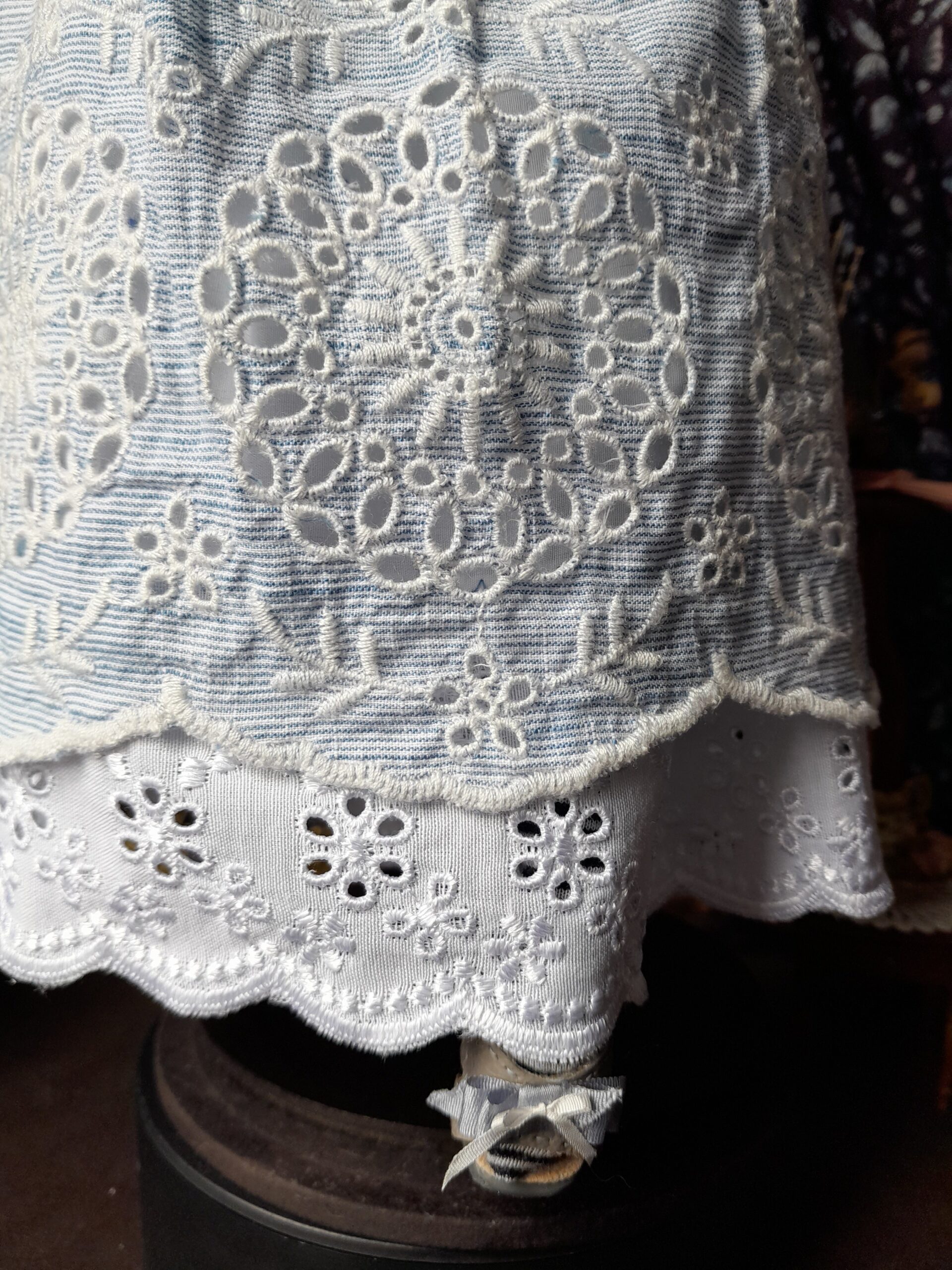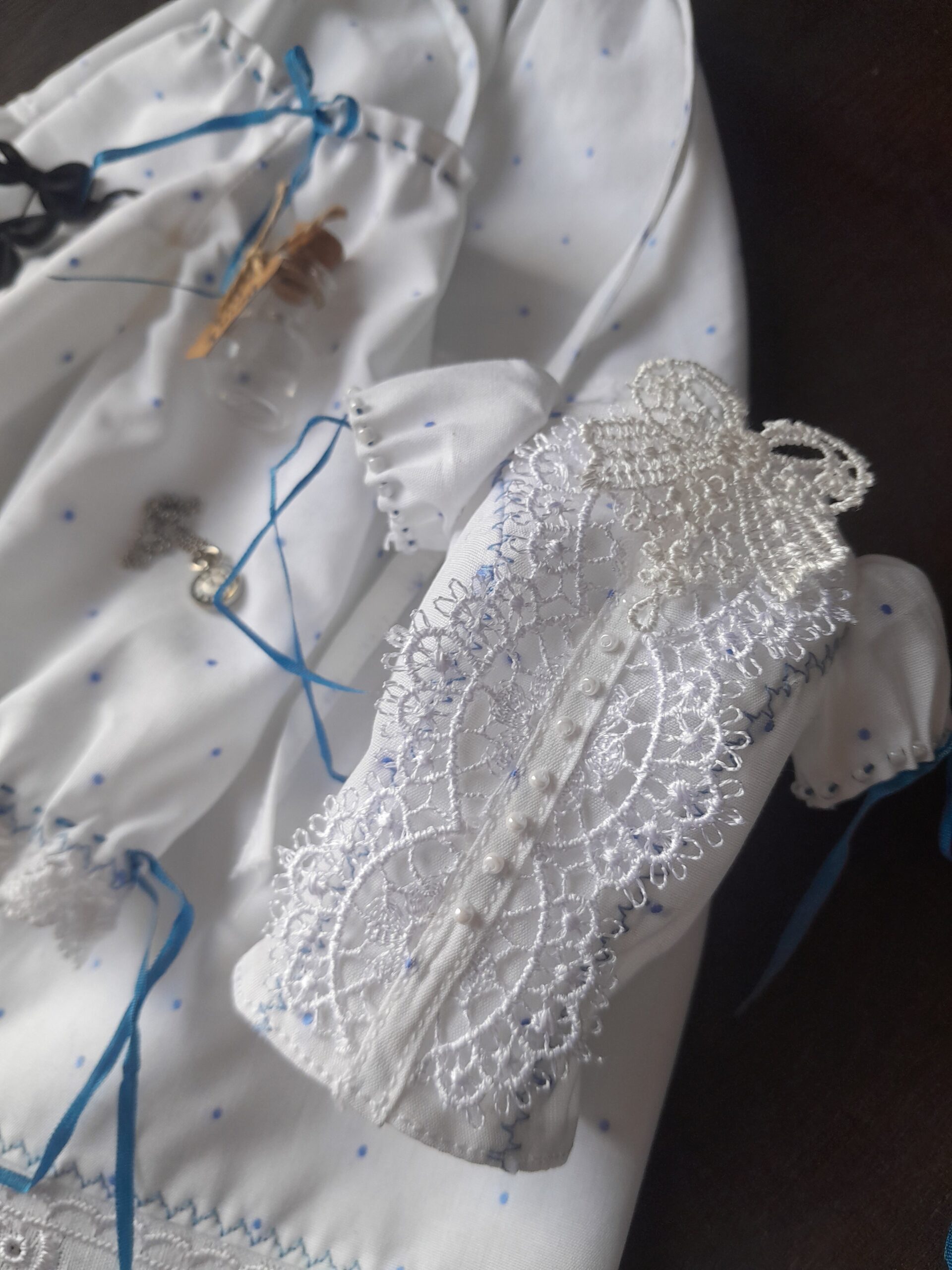 Built in delicate layers: a cotton underdress, vintage-inspired skirt, hand-crocheted lace details, fine beading, and silk ribbons. Each element is carefully composed by hand, creating a sense of quiet complexity and depth.