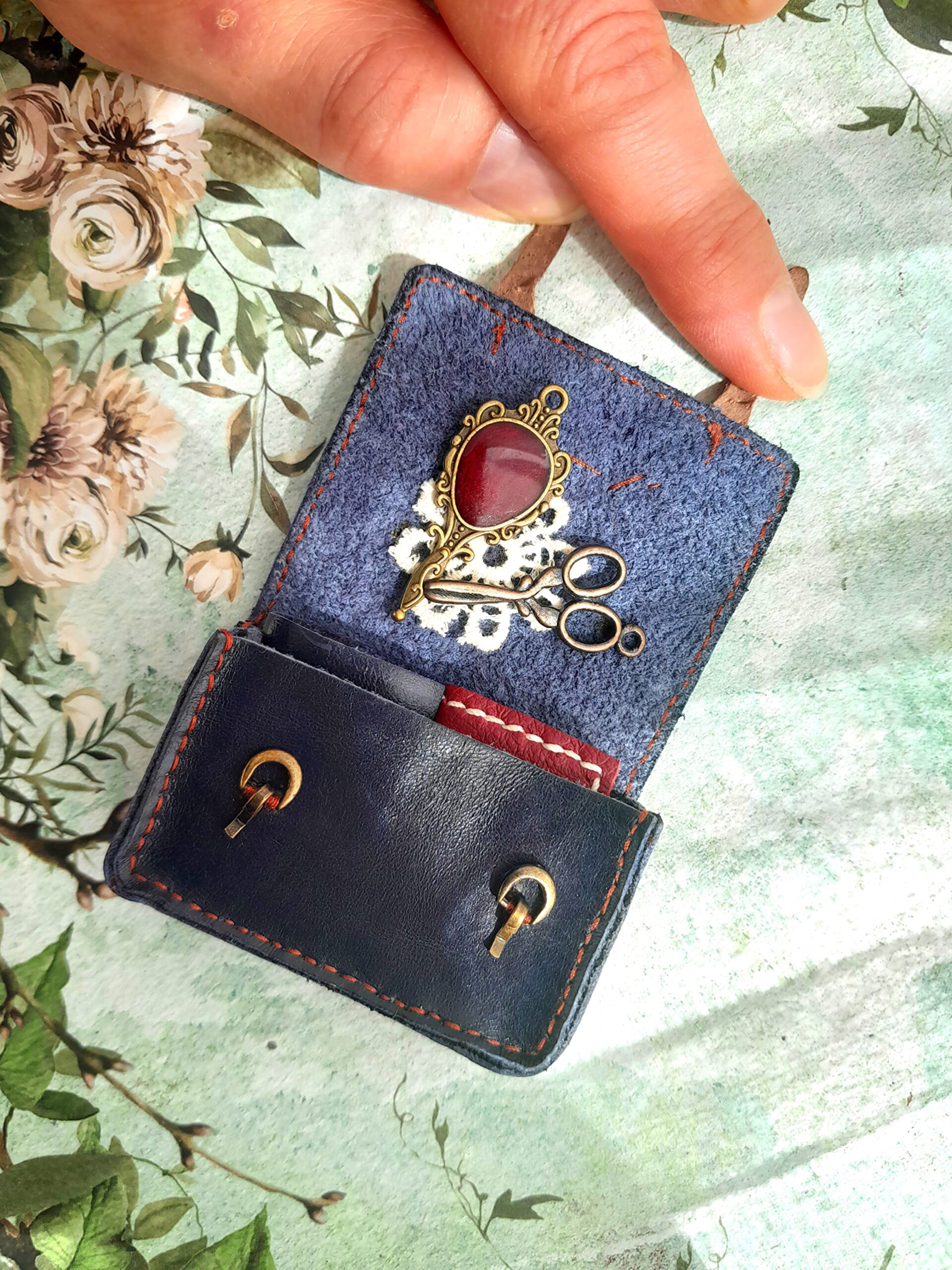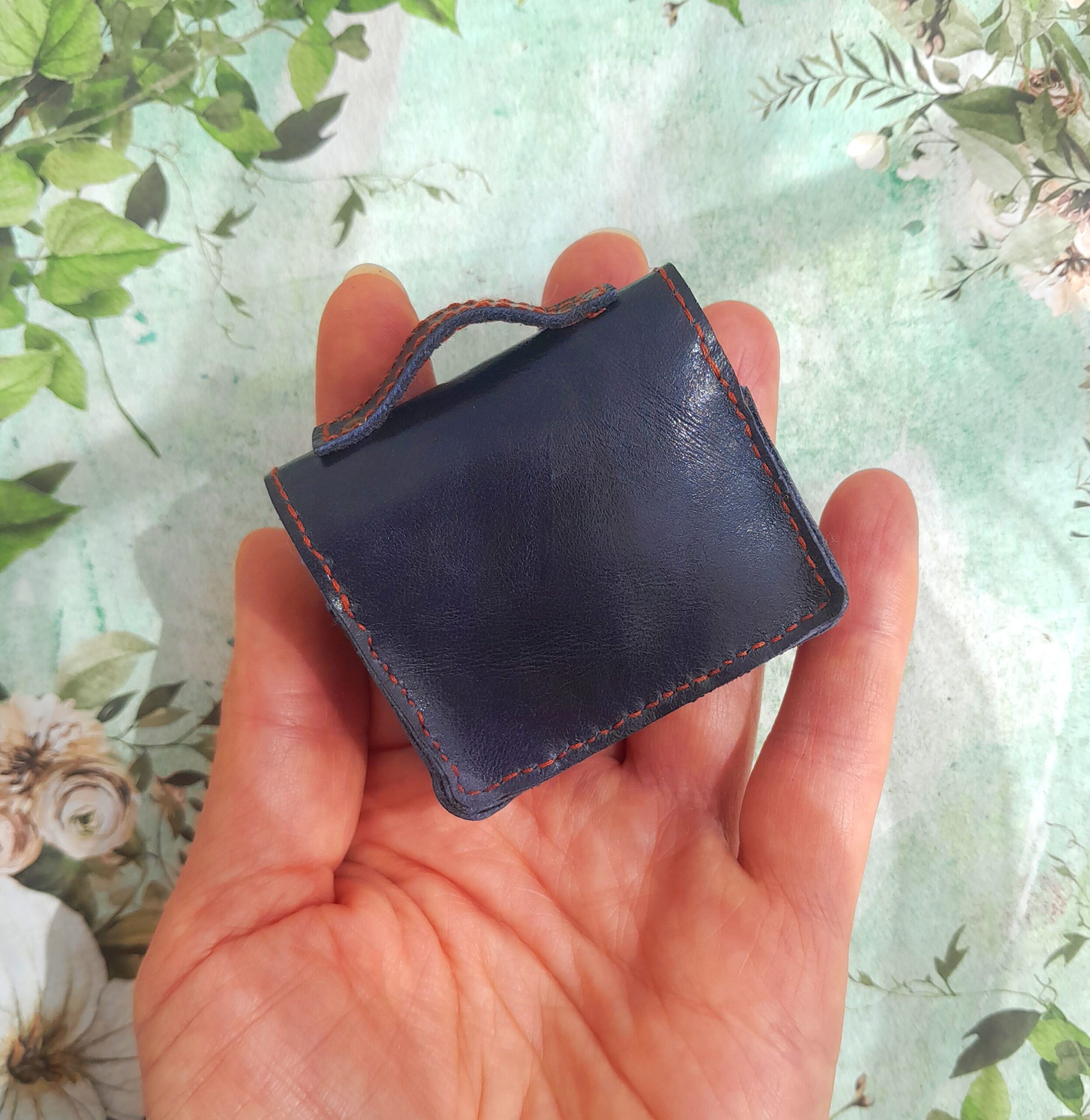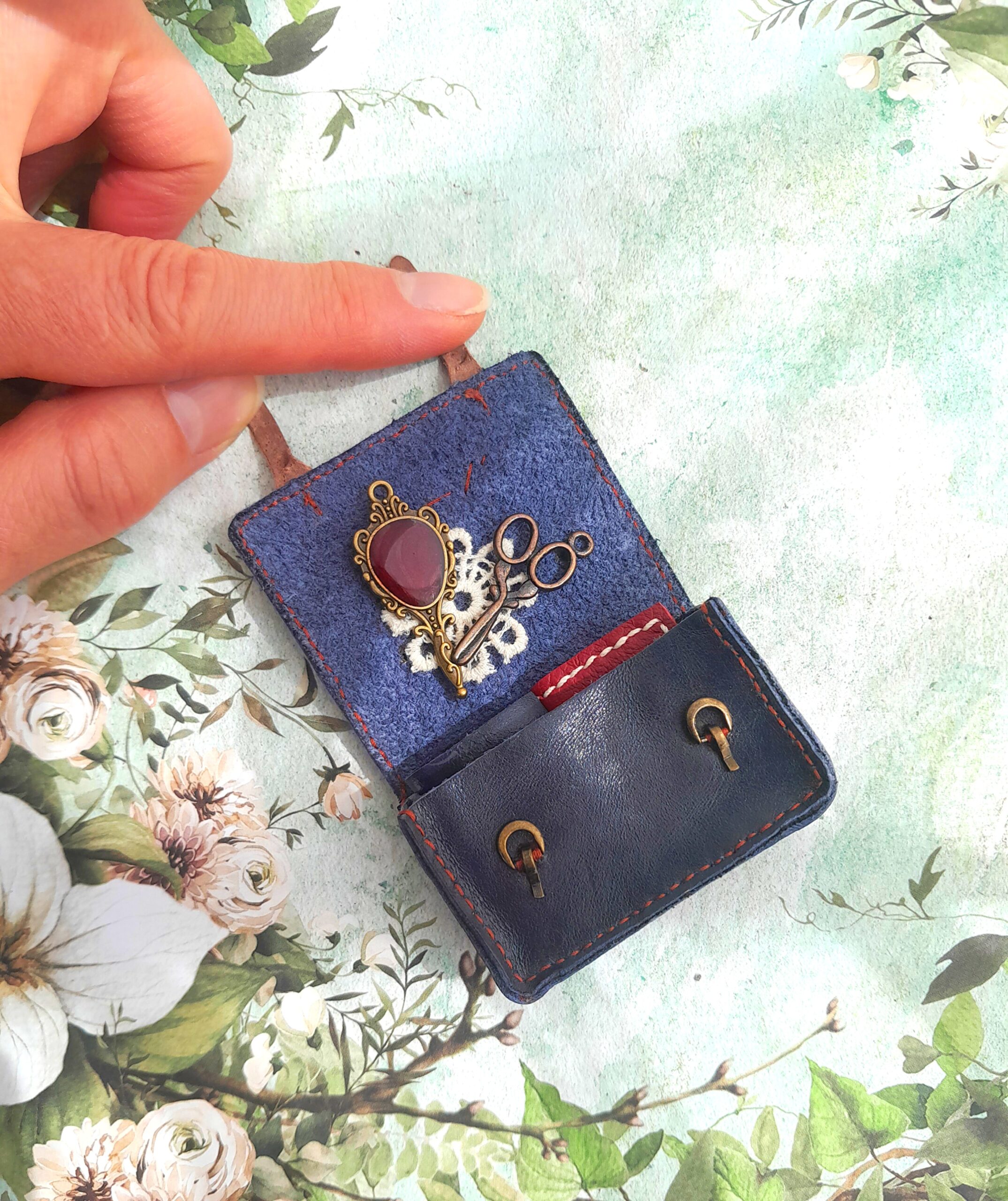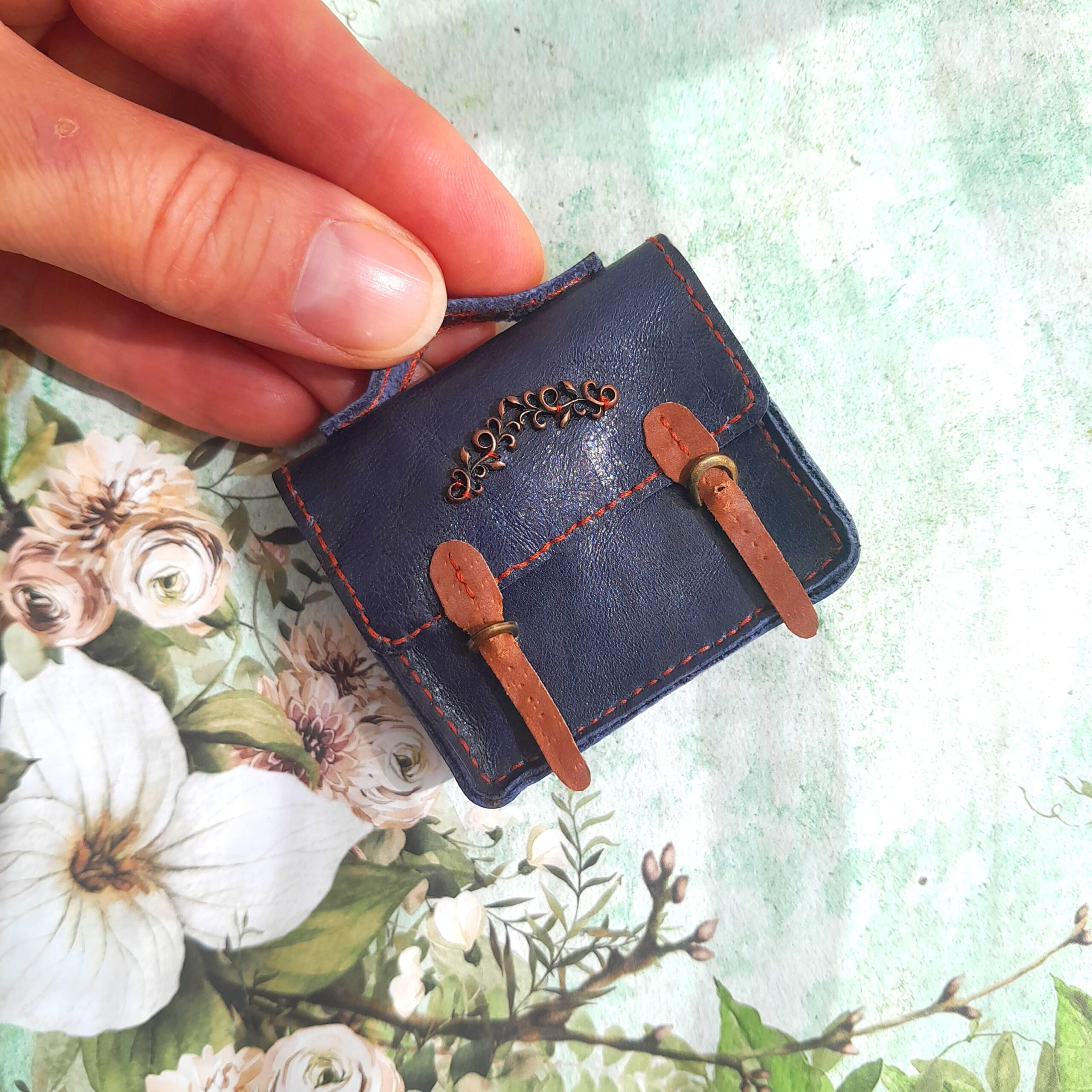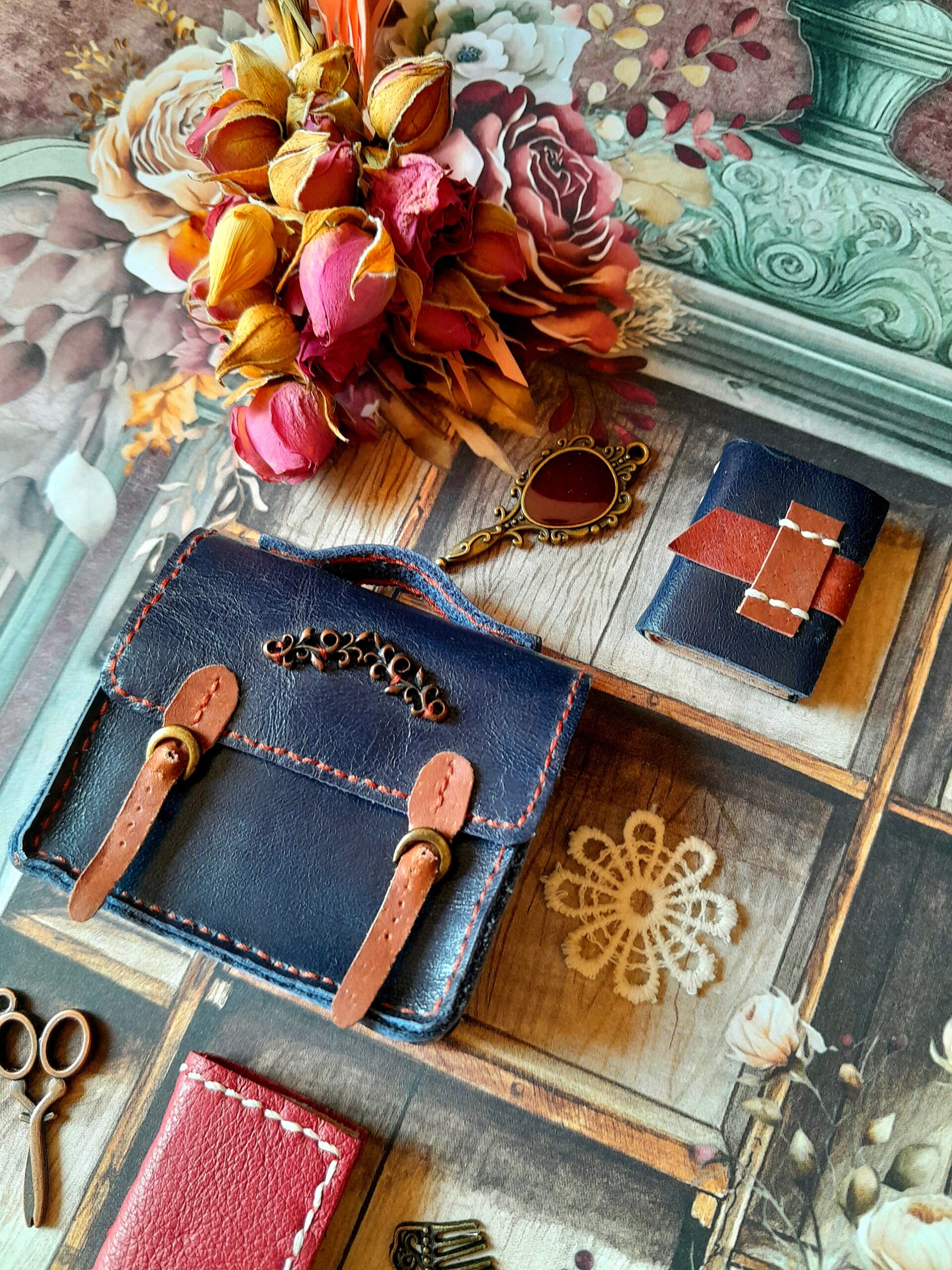 I make this miniature handbag from genuine deep dark blue color leather, wich feels soft and pleasant to the touch. In addition, I hand-embroider the surface with ginger-colored threads. This detail adds warmth and visual interest. Also I decorate the briefcase with metal filigree. As a result, the bag has a subtle vintage look and a rich handmade character.