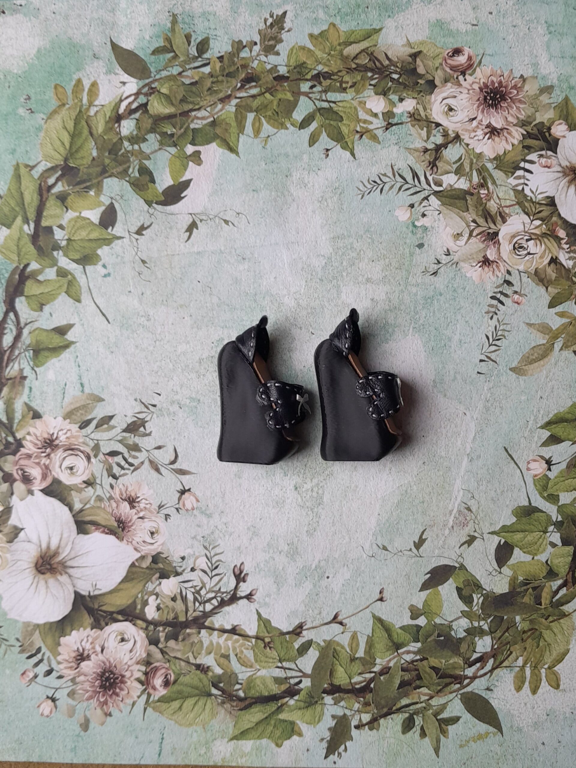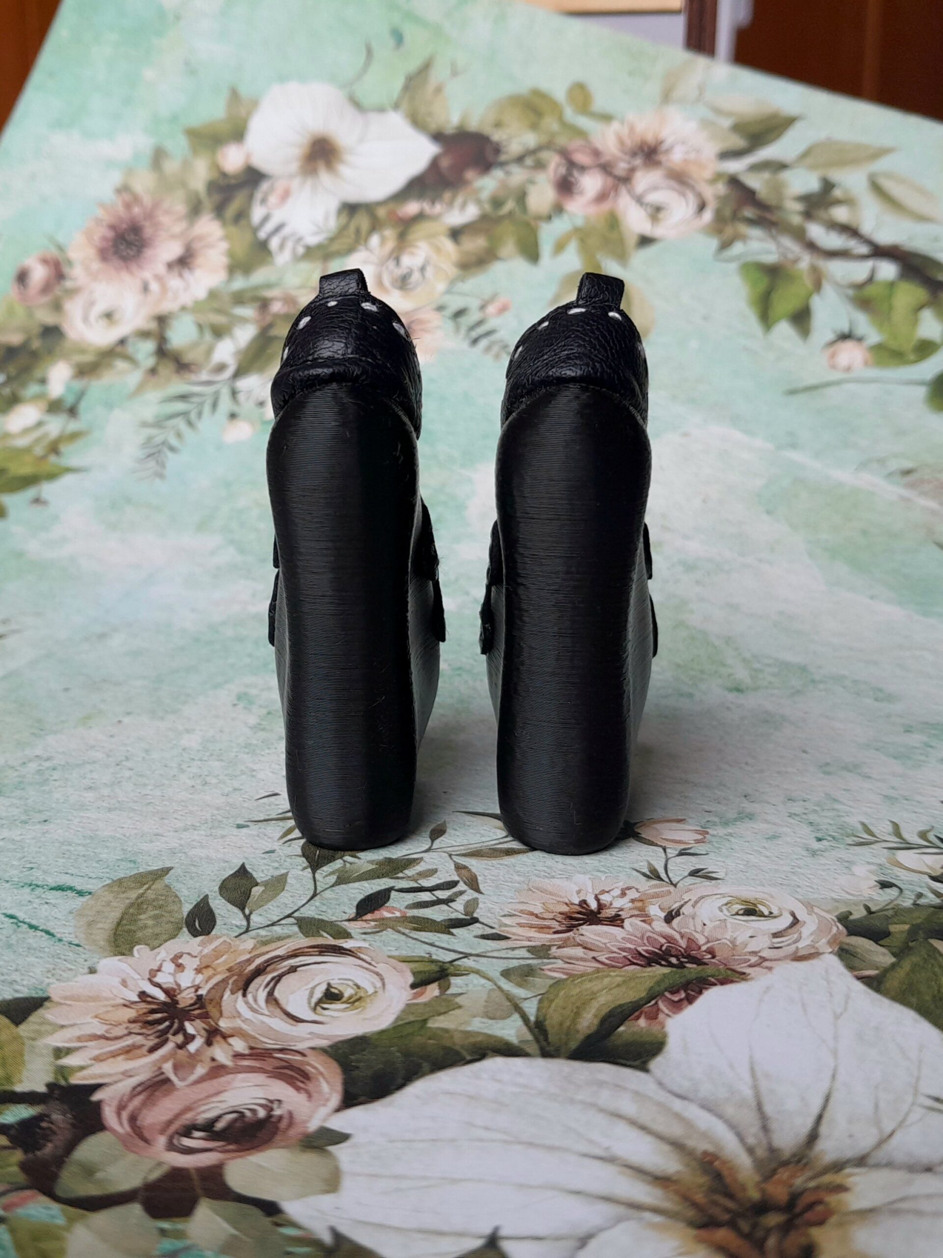 I make these miniature shoes from genuine smooth black leather. The leather feels soft and pleasant to the touch. In addition, I add a beige sole to create gentle contrast. I finish the shoes with a white silk bow and a hand made embroidery, which gives the design a light and elegant detail. I make the platform heel from durable PLA, so it keeps a stable shape and looks neat.