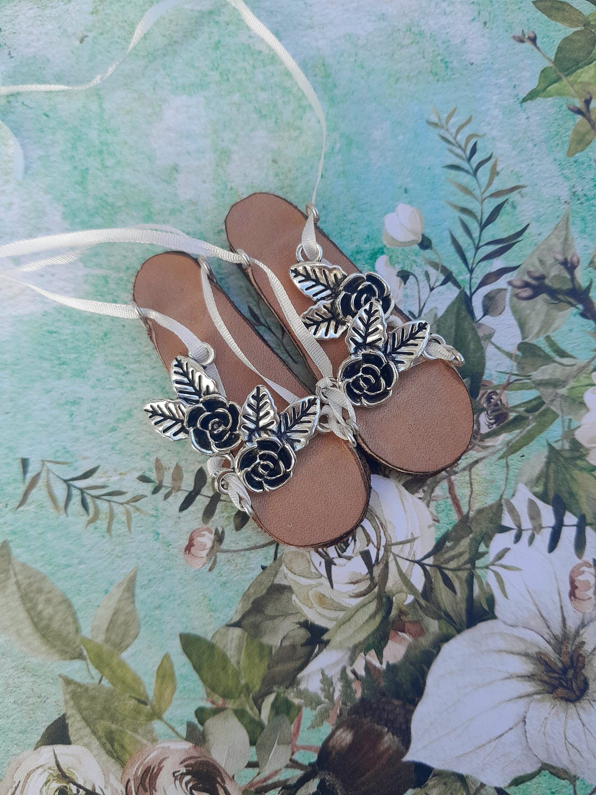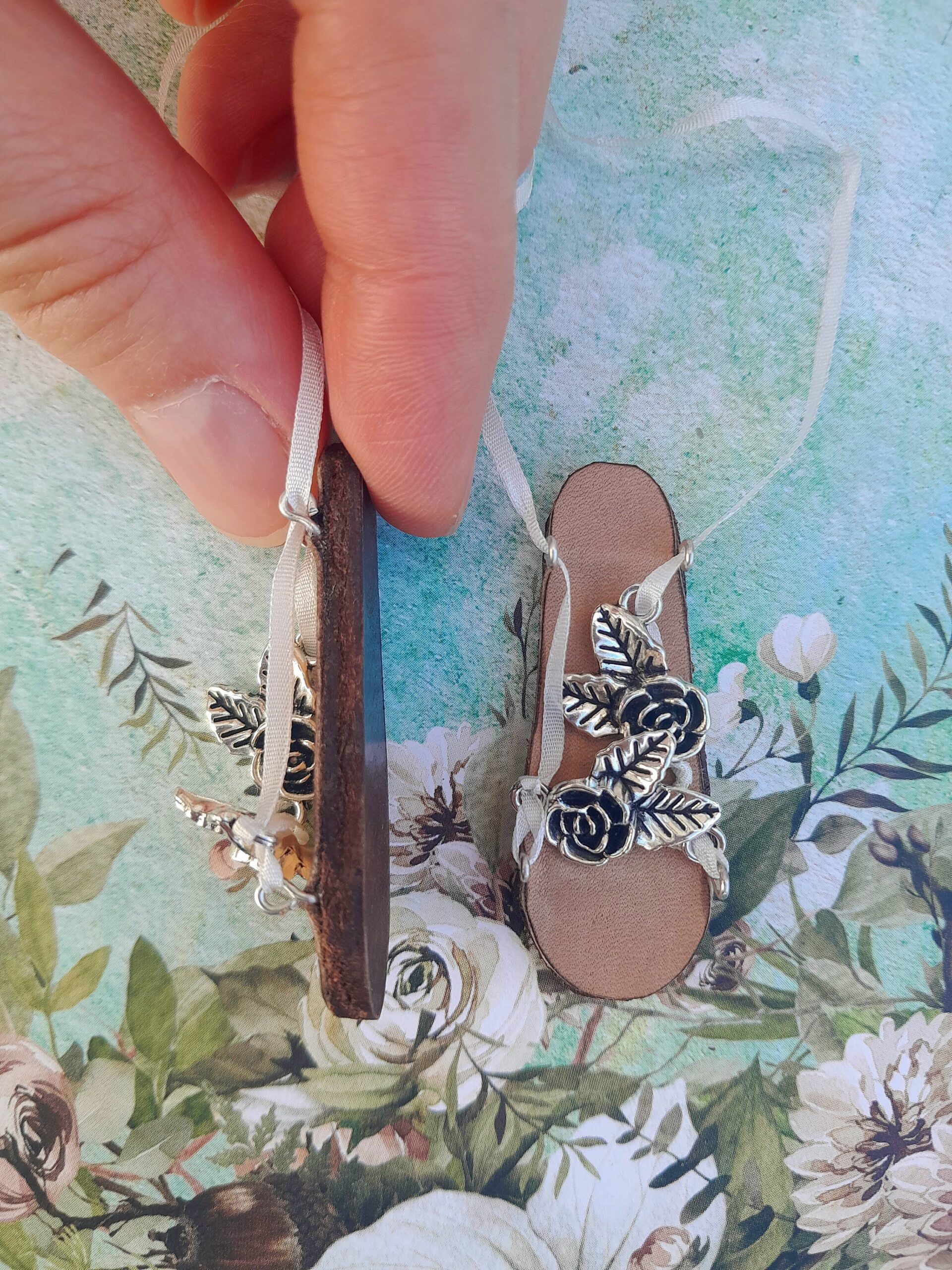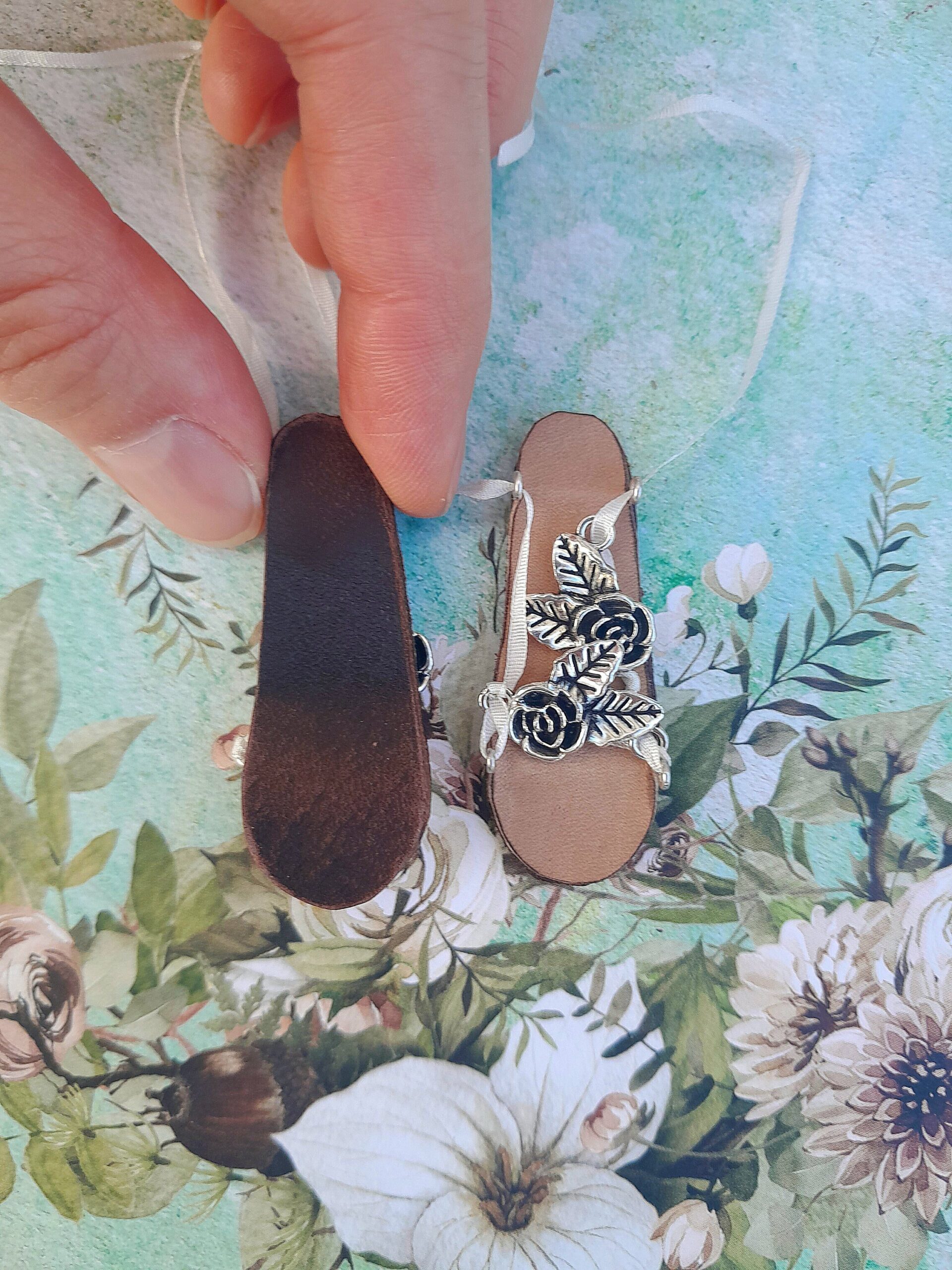 I make these miniature sandals from white silk, which feels soft and looks delicate. Moreover, silk gives the shoes a clean and airy appearance. I decorate the sandals with metal filigree, which adds a gentle decorative detail and a touch of elegance. In addition, I use a genuine brown leather sole and a beige leather insole. Because of this construction, the shoes keep their shape well and look realistic on the doll’s foot.