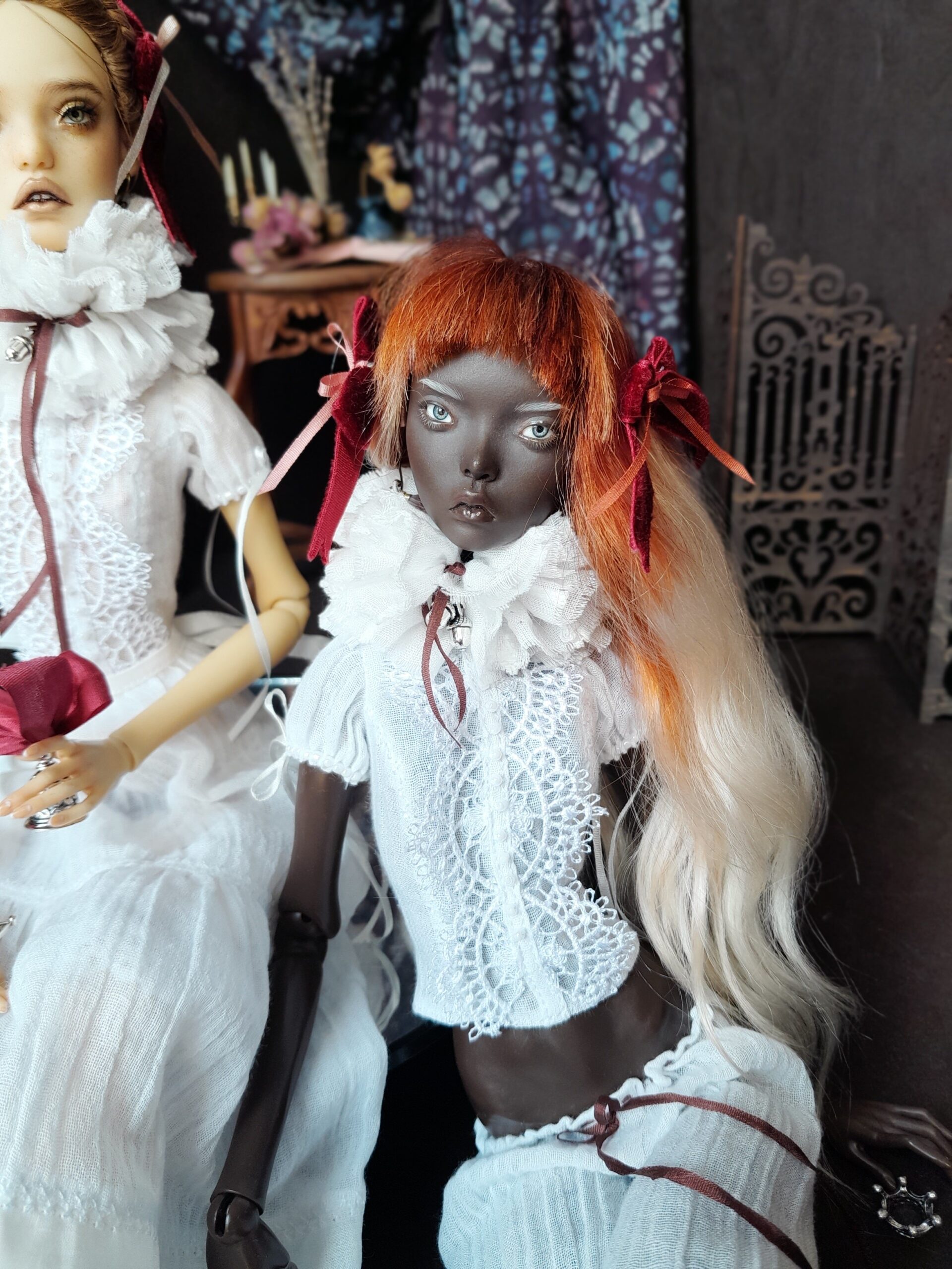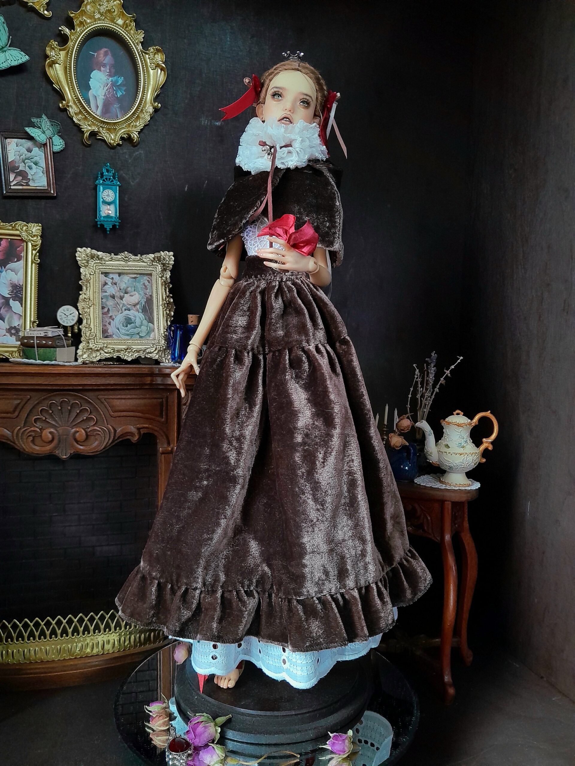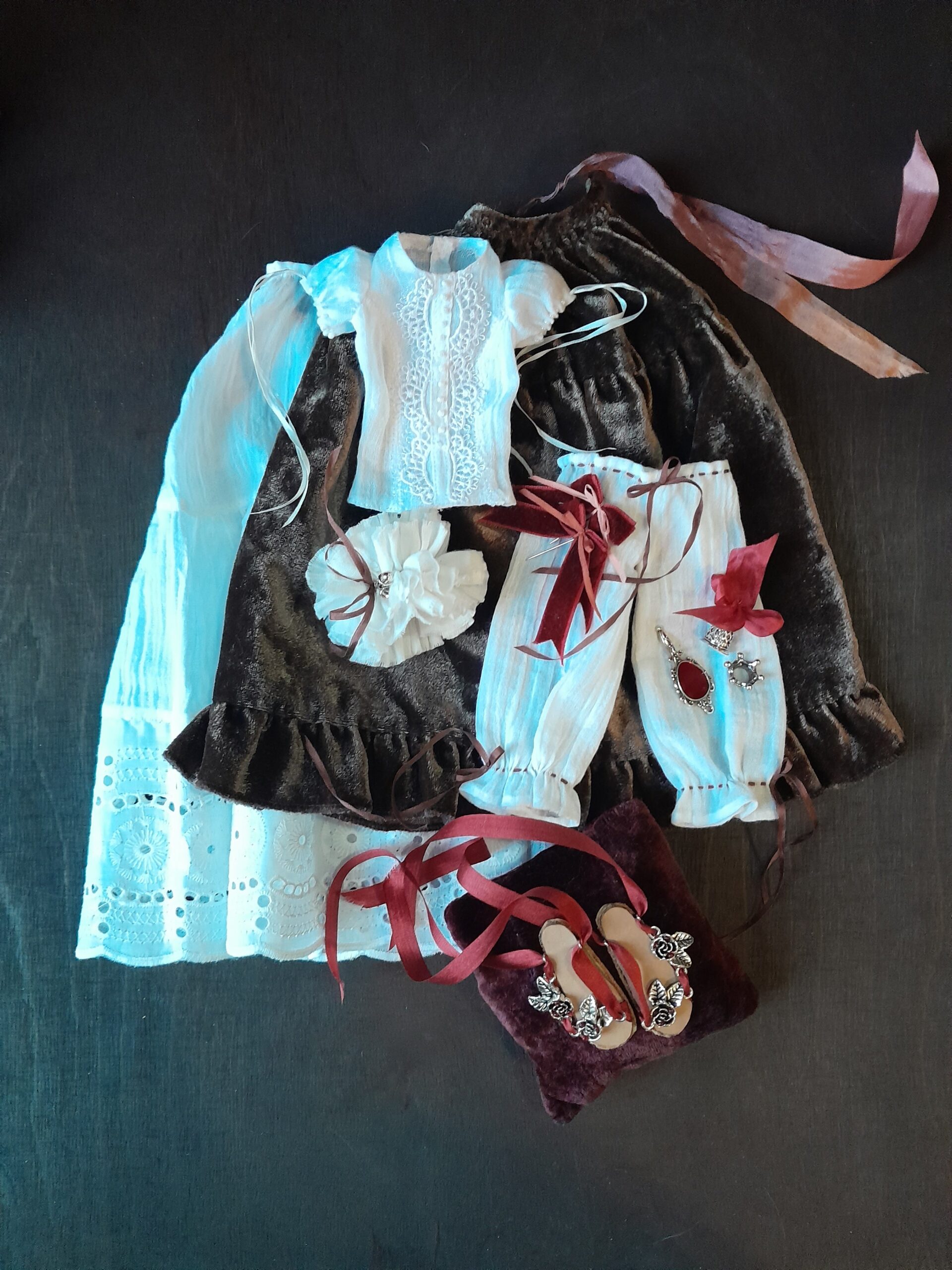 One of a kind collector couture outfit for Popovy Sisters Body 2 & 3. Velvet, lace, silk ribbons and handmade details. Ready to ship.