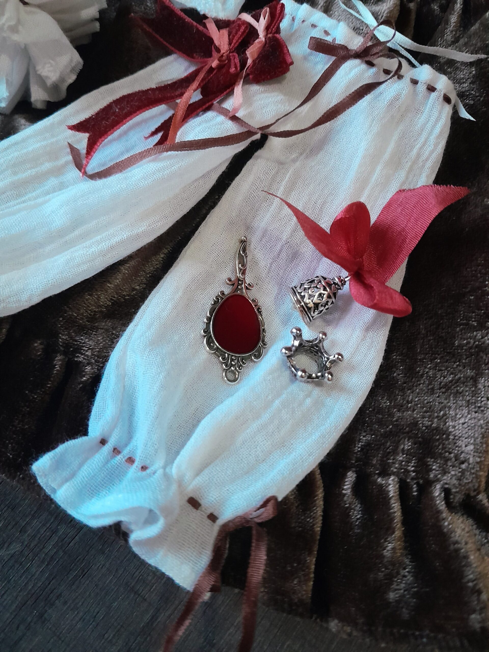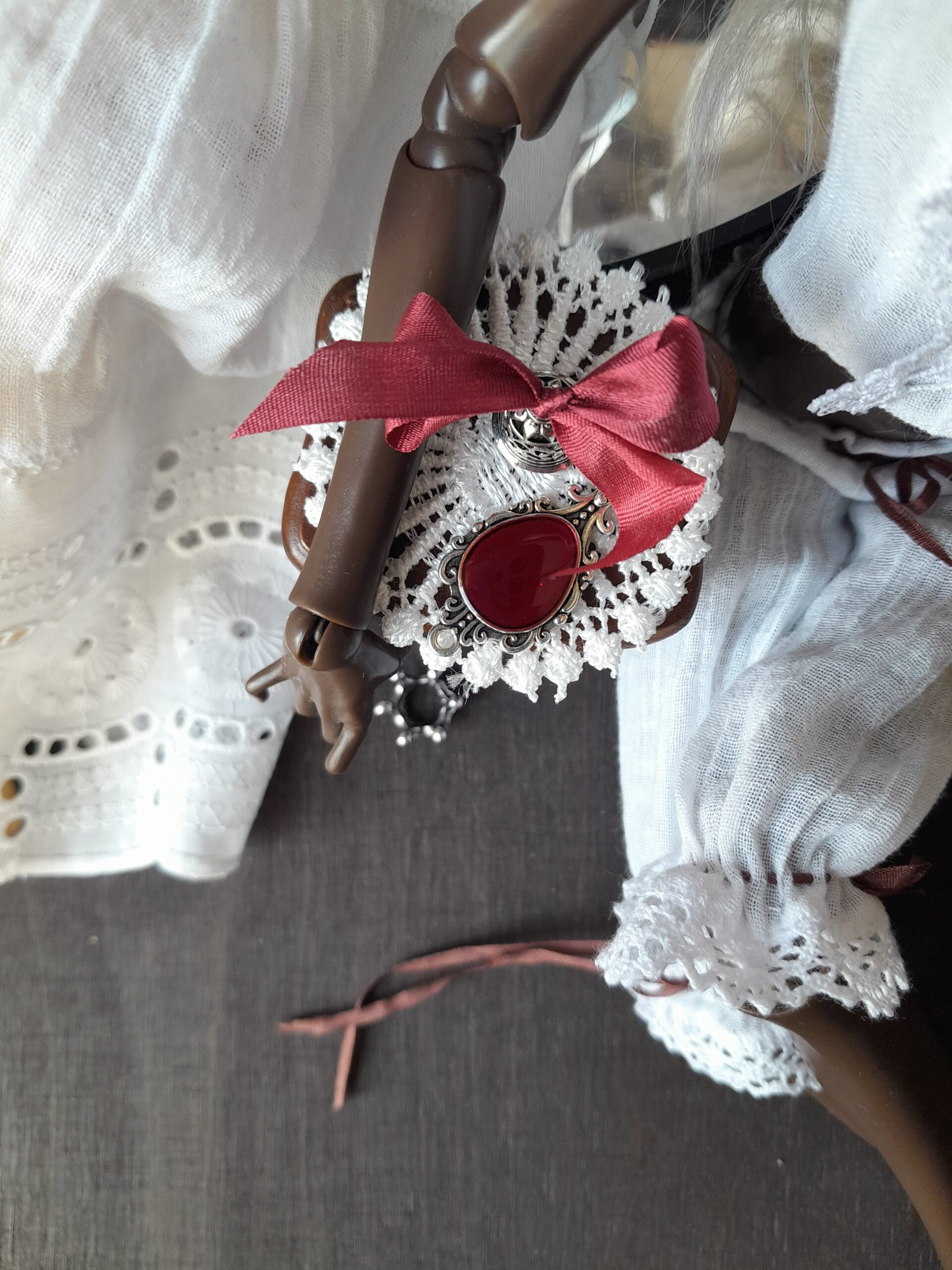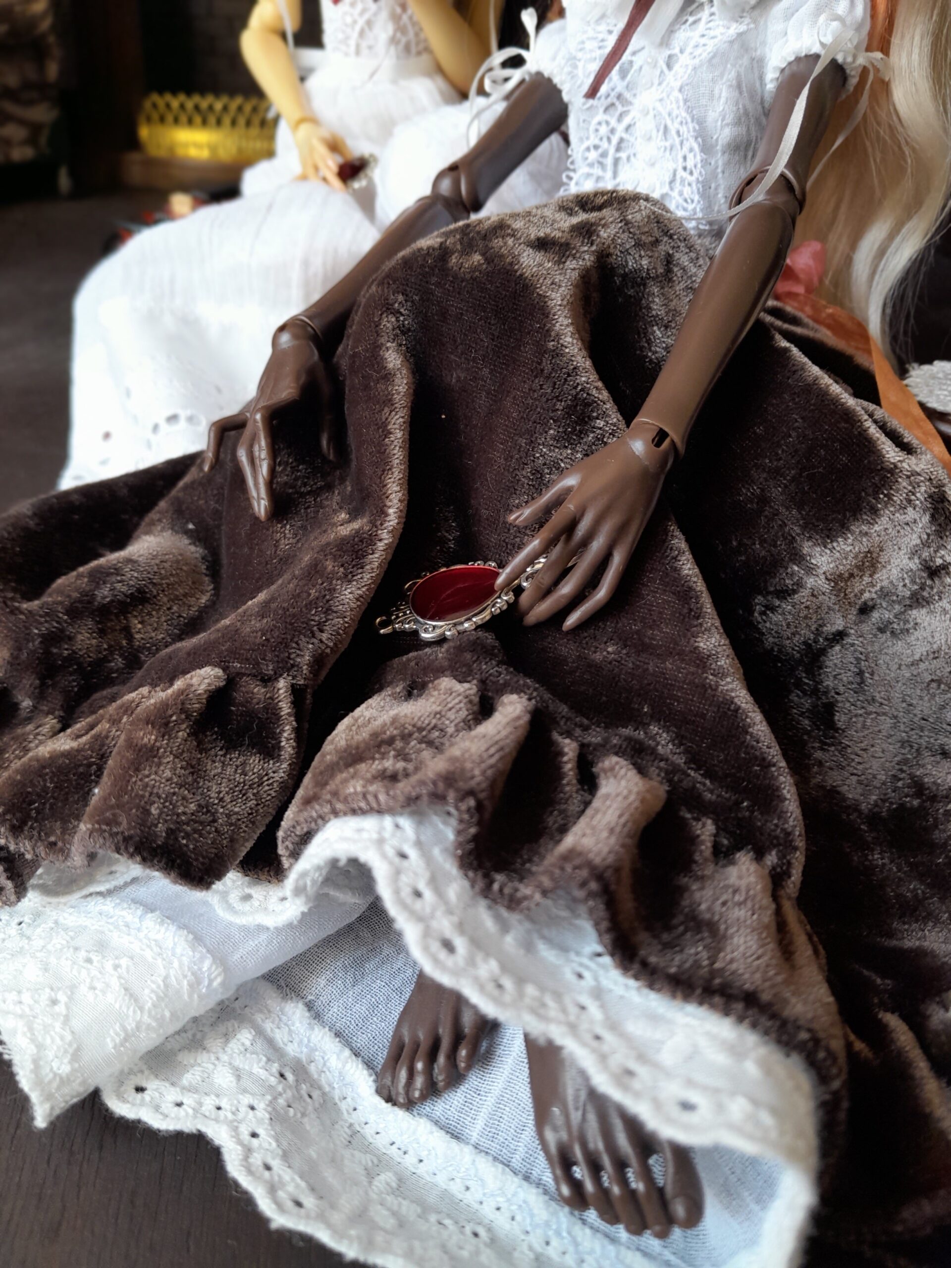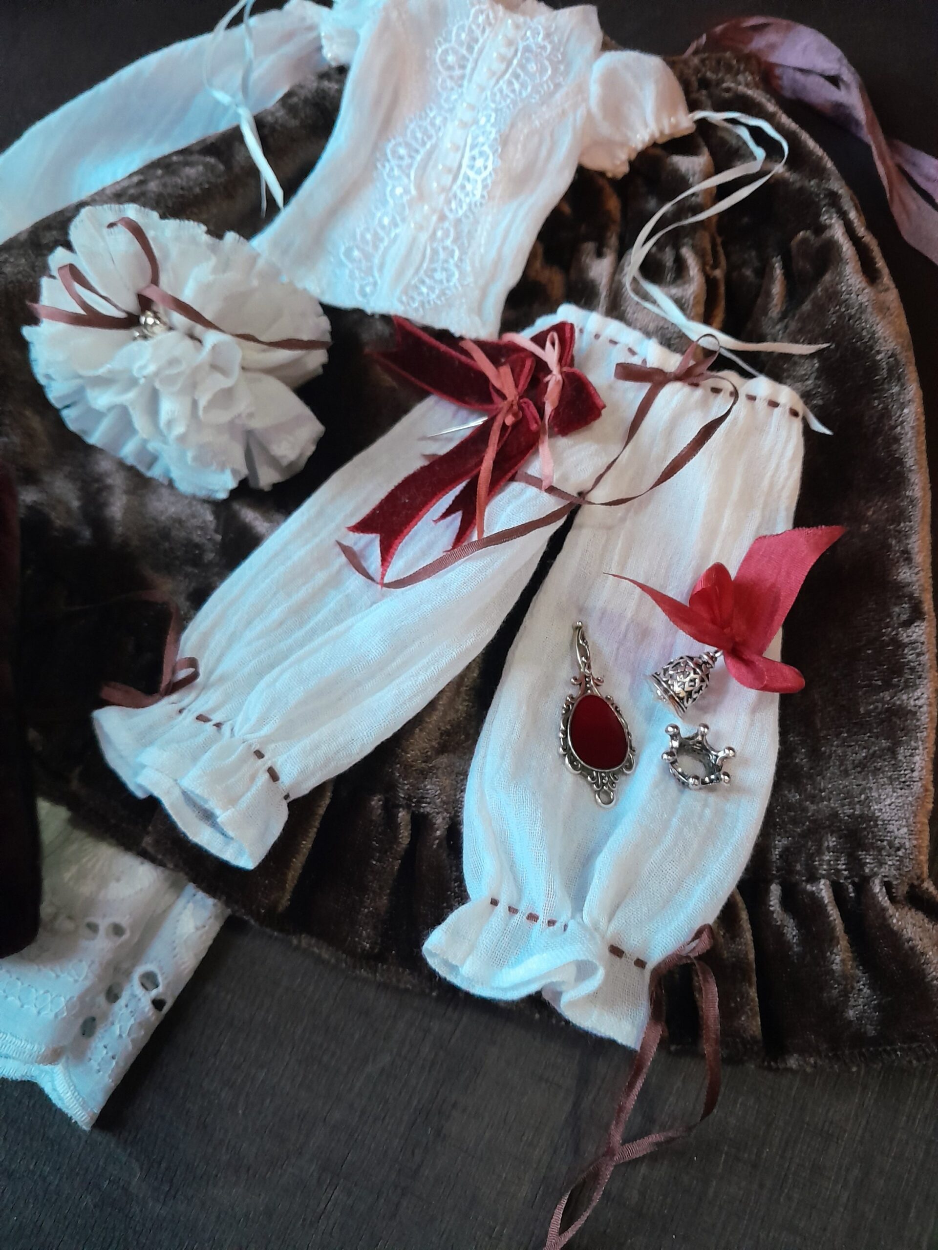 This piece is built around contrast — soft white cotton and deep chocolate velvet, structured silhouettes and delicate textures. Layers of fine lace, silk ribbons and hand-finished details create a quiet, intimate composition, where each element feels intentional and slightly hidden.